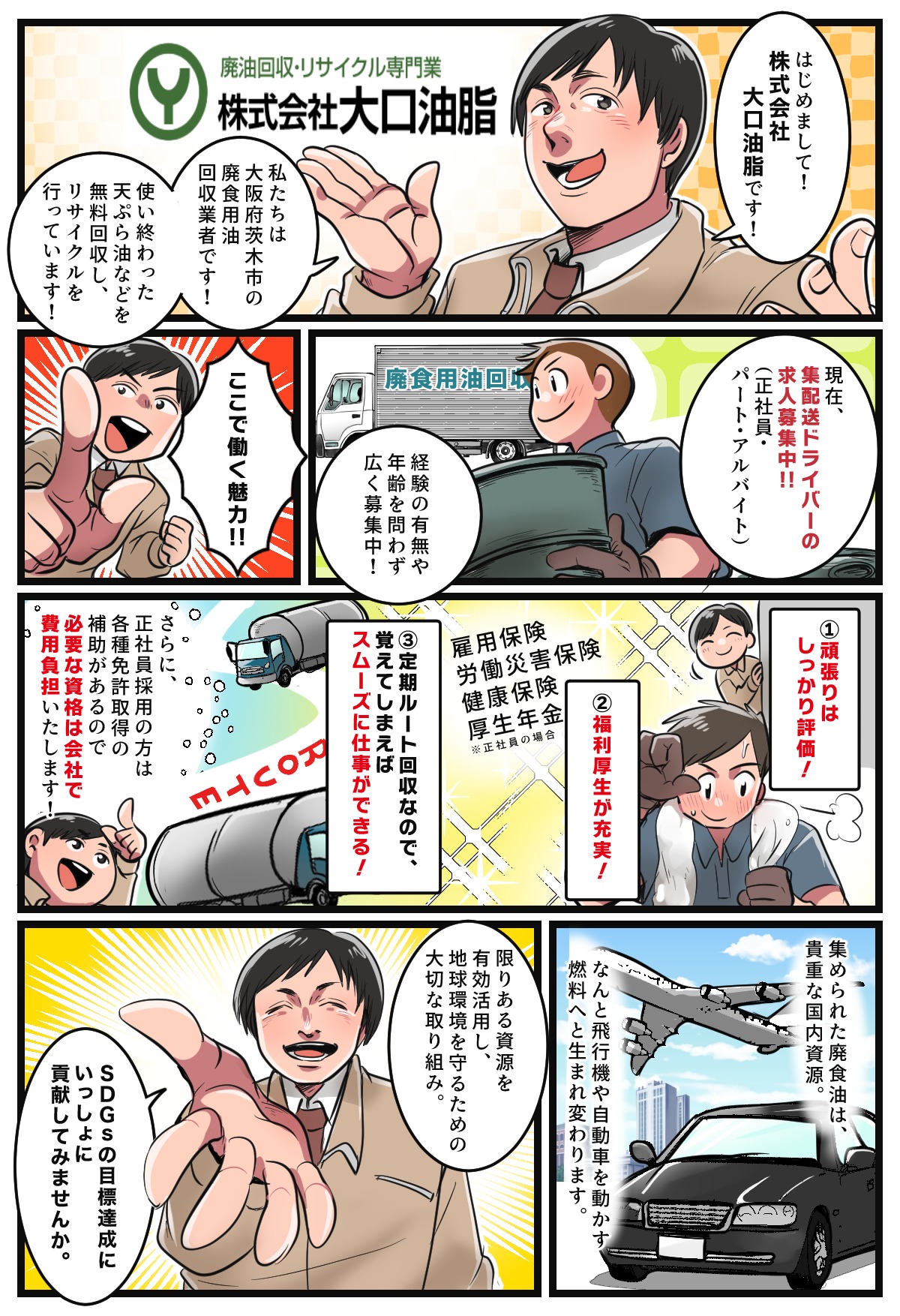 株式会社大口油脂は、大阪府茨木市の廃食用油回収業者です。使い終わった天ぷら油などを買取回収しリサイクルを行っています。この度、業務拡大に伴い新たな集配送ドライバーの募集を行うこととなりました。経験の有無や年齢を問わず広く募集しているため、地元地域で働きたい方や当社の業務にご興味がある方は、お気軽にご応募ください!